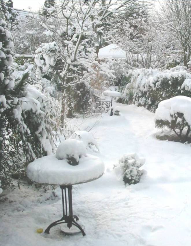 Wat me intrigeert is die hoop op de tafel. Wat ligt er onder? Een plastic zak? Verloren tuinhandschoenen? Een stapeltje onbestemd, nu ondergesneeuwd, en in de lente zien we wel weer …..? Neem je dat risico? Misschien is het wel een schat. Een bankrover die juist op jouw tafeltje, vlak voordat het ging sneeuwen, een zakje bankbiljetten heeft achtergelaten, eventjes, omdat hij moest plassen, en nu kan hij het niet meer terug vinden. Of een lieve fee die van jullie houdt en op deze manier anoniem iets had willen achterlaten, misschien wel chocolaatjes. Voor jullie om lekker de volgende morgen op te peuzelen.