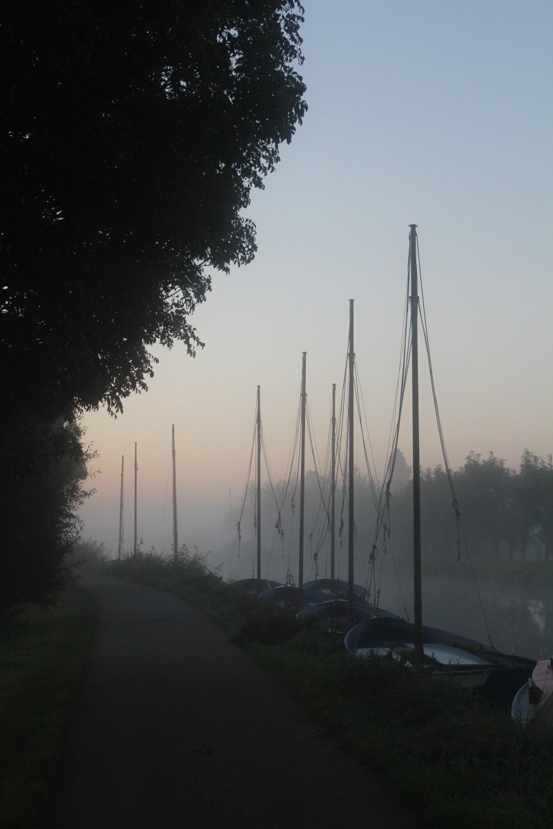 Een lichtpunt in zijn leven is al jaren lang een prachtige foto – genomen door Pawi – van zeilbootjes in het water in de mist. Zij wandelde ooit in de polder. “De zon was nog net niet op, de velden werden aan het oog onttrokken door de ochtendnevel” en hopla, daar maakte ze ineens een foto van de zeilbootjes in “roerloos water“. Die foto fleurde de destijdse site van Timmerark op, toen hij nog niet opgeheven was althans, zoals al zijn sites. Hier komt de foto, voor het eerst op het echte internet: