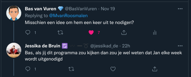 Hier zag ik vorige week op Twitter een hilarisch voorbeeldje van naar aanleiding van een grappig tweetje van me naar Marcel van Roosmalen die een interview van Jan Slagter plaatste waarin deze het grappige Media Inside afkraakte. De running gag van het Media Inside team is het hele seizoen al dat ze aan het einde van elke aflevering Jan uitnodigen om ook eens langs te komen. Jan wil niet, want hij heeft om de een of andere reden een hekel aan de heren (Marcel en Gijs Groenteman, jazeker, de zoon van …). Mijn tweetje naar aanleiding van het stukje was dus: “Misschien een idee om hem een keer uit te nodigen?” De hilariteit was algemeen, maar toen kwam er een tweep voorbij die reageerde met: “Bas, als jij dit programma zou kijken dan zou je wel weten dat Jan elke week wordt uitgenodigd”