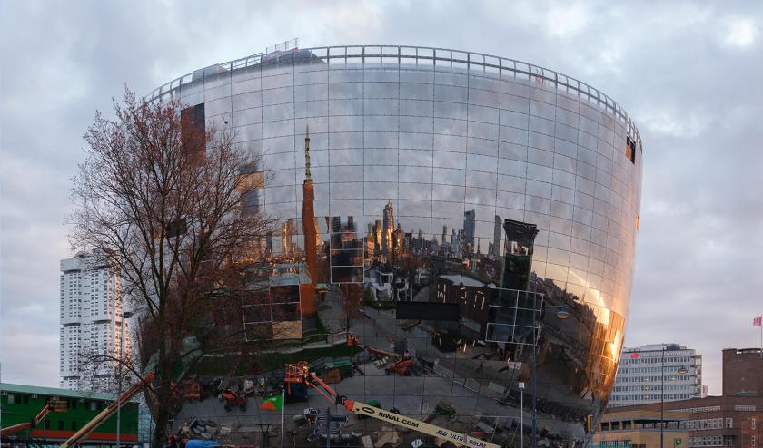 Op donderdag was er geen ikje. Scheldkanonnades natuurlijk, daar word je niet goed van. Ook op Twitter werd de redactie helegaar verrot gescholden, echt genant. Maar ja, het was Hemelvaartsdag en dan wil de redactie ook weleens met een schort om achter de barbecue in de achtertuin staan. Pawi reed naar Rotterdam en bekeek het Depot. “De kroketjes zijn ook daar aan de kleine kant, dat wel”, oordeelde ze. Ik zou zelf voor kroketten een stuk dichterbij huis blijven. En het concept bevreemdt me. We gaan toch ook niet in het magazijn van V&D kijken, maar wachten netjes tot die hun voorraad keurig met etiketten en al hebben uitgestald? Man man … Boijmans, de Lidl onder de musea, hoor. Maar goed, volgens Pawi had Boijmans ook voor de sluiting al een raar concept en hing alles door elkaar, van middeleeuws tot pop-art. In het Depot stoort dat niet, volgens haar. Gaat ook dat zelf zien, zou ik zeggen. Het ziet er van buiten in ieder geval prachtig uit. En als je goed kijkt dan zie je Pawi en de chaperon weerspiegeld op de parkeerplaats.