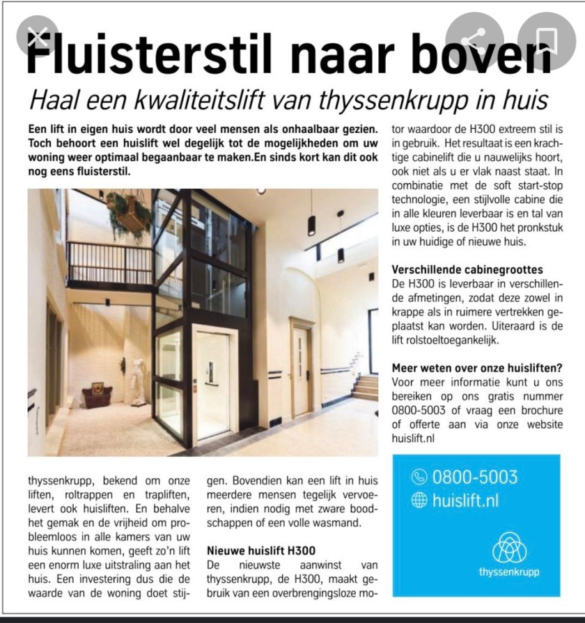 Een van de kortste ikjes uit de geschiedenis was die van Henriëtte Gaillard. Het komt erop neer dat ze onder de overlijdensberichten een advertentie voor een lift zag: “Fluisterstil naar boven”. Da’s de korte samenvatting dan, hè. De pointe. En het hele ikje! Woord voor woord. Nou en toen had je de poppen aan het dansen, want de boze buurman kopieerde de betreffende nog verse overlijdensadvertenties uit de krant en zette ze op zijn lollig bedoelde maar gelukkig vrijwel onbezochte site. Een paar dagen later zette hij ook nogeens schaamteloos een screenshot op zijn blog waarop je het emailadres en het IP-adres van een reageerder, ome Piet, kon zien. Hoe je als blogbeheerder, die hoe onbetekenend hij zelf ook is wel dingen voor de openbaarheid op het internet kan plaatsen, put- en putdiep kunt zinken. Ik had er geen woorden voor. En bood de nabestaanden namens alle wel normale blogbeheerders plaatsvervangend excuses aan. De trapliftadvertentie zelf, daar is niks mis mee, dat zien jullie wel.