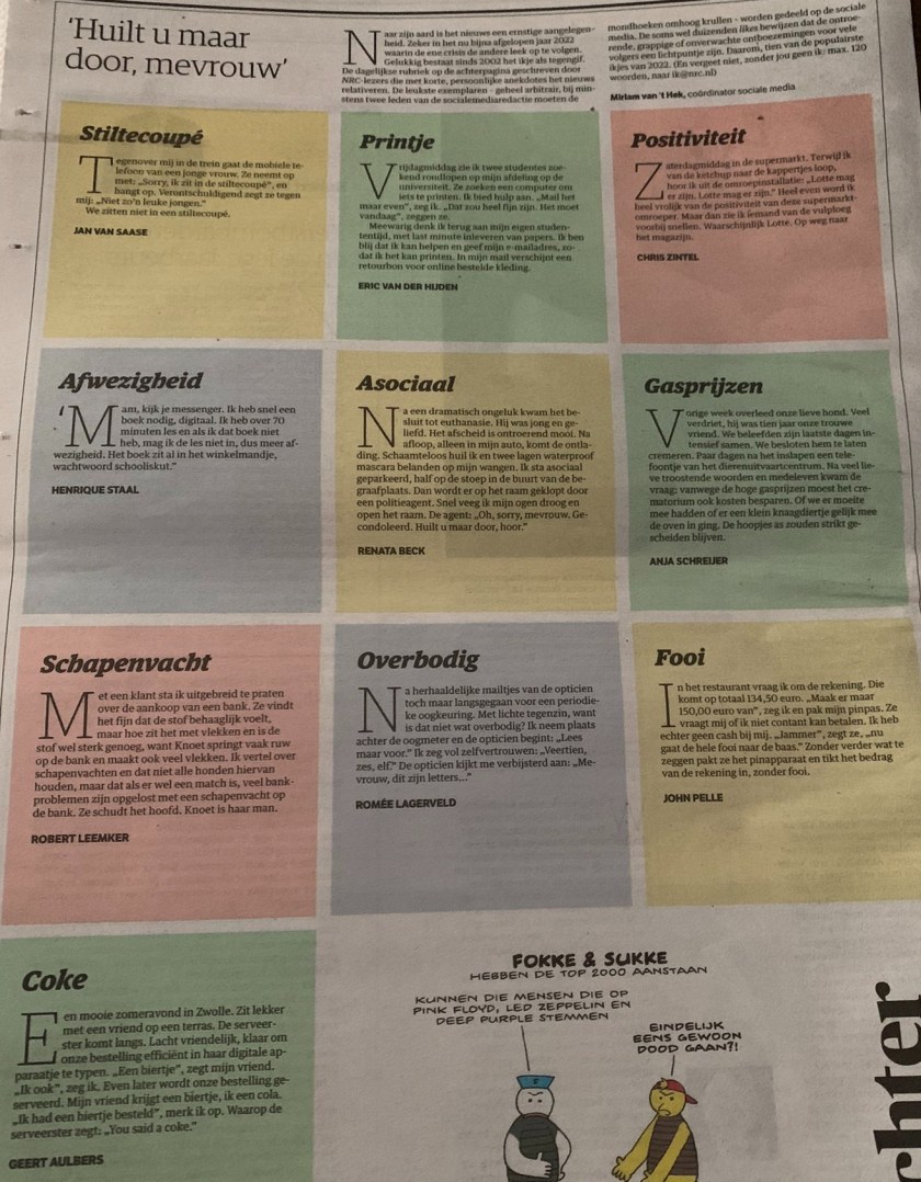 Prachtig toch? Het rillen, het prevelen, het zachte gezicht, de stille eenzame rouw om het verlies … En ja, wat een ongevoelig en bijzonder naar persoon moet je dan zijn als je als commentaar op deze broze gebeurtenis opschrijft (ook dit citeer ik volledig): “Met een brok in mijn keel stammelde ik “badmeester, ben…ben ik al bruin?” “Als me reet, mevrouw!” Was getekend: DSR. Echt heel akelig. Maar goed, het ikjesjaar 2022 kwam daarmee ten einde. We zien wel wat het nieuwe jaar brengt.