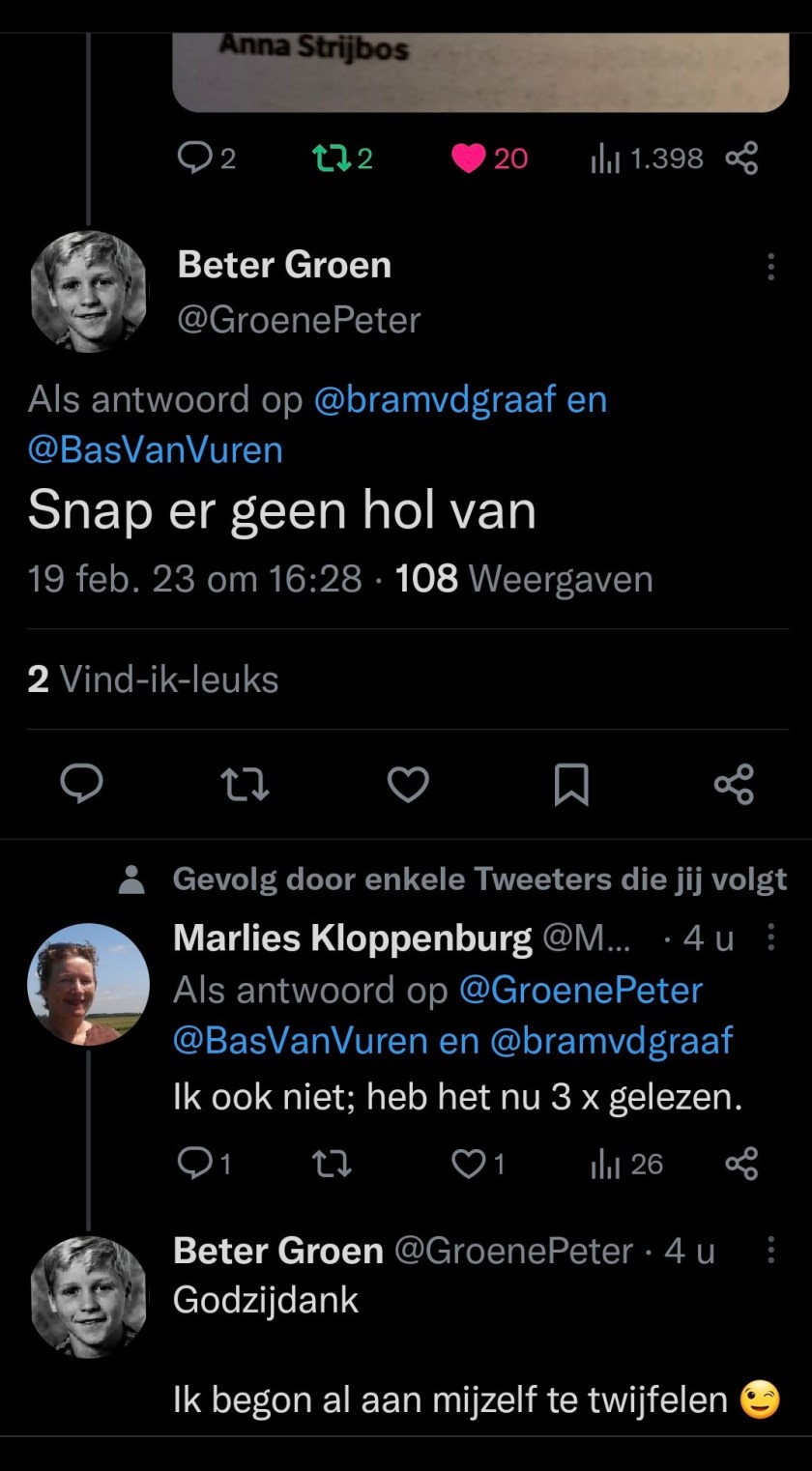 Bertie stelde trouwens als eerste lezer (m/v/o) vast dat de week weer was begonnen. Dat was vorige week maandagochtend om 10:19 uur om precies te zijn, Ze werd daarbij wel geholpen door het lezen van het vorige weekoverzicht. Jaja, je kunt er de klok bijna op gelijk zetten. Ook die functie van het weekoverzicht wordt nog weleens vergeten.