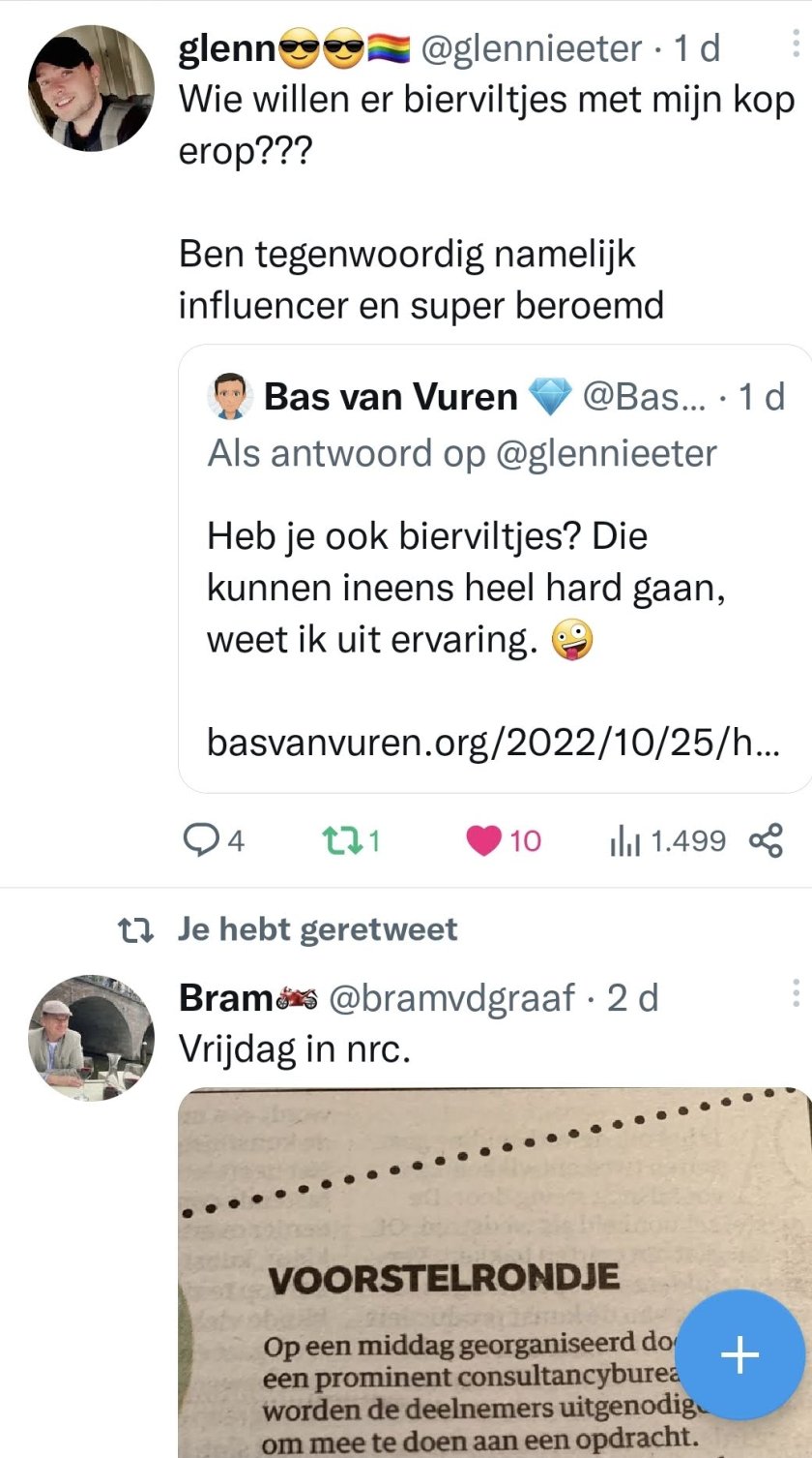 Een druk medium, twitter. Leuke dingen voor jou maar ik zal er niet gauw opnieuw aan beginnen.