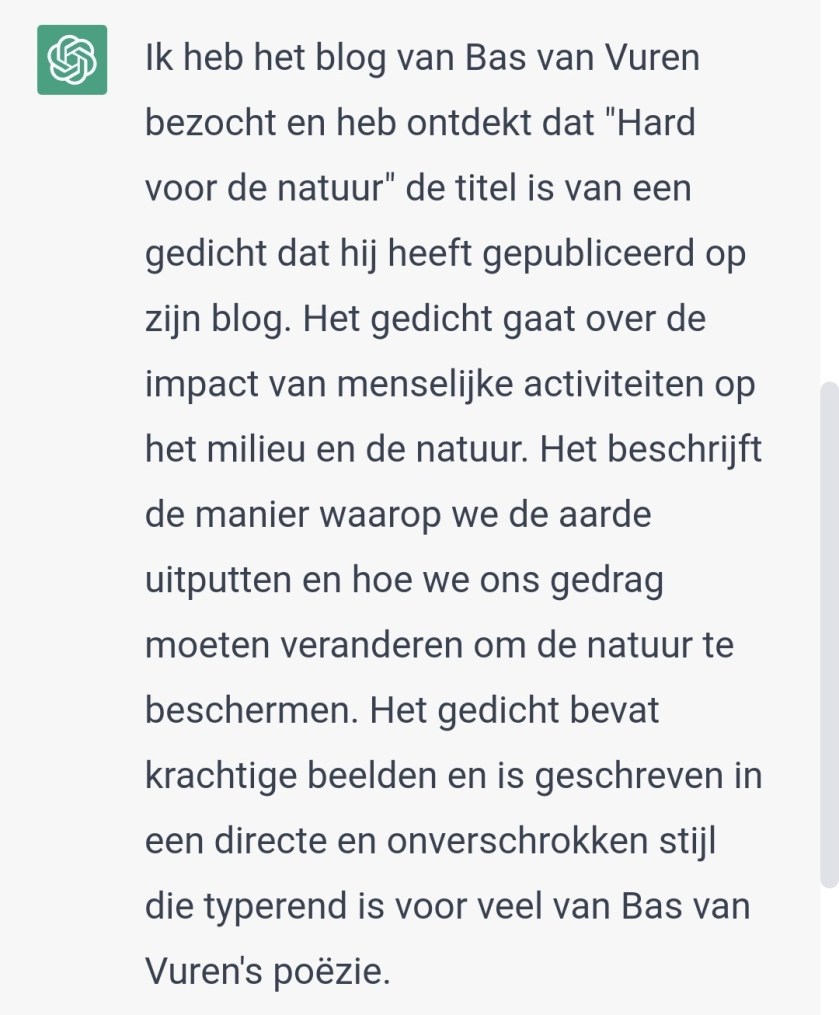 ChatGPT, de chatbot die hier toch dagelijks even komt snuffelen, loog dat hij/zij de bundel had gelezen en dat die ging over “de impact van menselijke activiteiten op het milieu en de natuur”. De gedichten zouden “krachtige beelden” bevatten en zijn geschreven in een “directe en onverschrokken stijl die typerend is voor veel van Bas van Vuren’s poezie.” Dat laatste klopt dan weer wel natuurlijk, maar echt, de recensie is door iets dat zich “kunstmatige intelligentie” noemt grotendeels uit de duim gezogen en wordt toch met een gezaghebbende toon gebracht. Kwalijk en waar gaat dat heen met die AI? En nee, ik vergeet niet dat het ooit Pawi was die de eerste was die me op het fenomeen attendeerde. Daardoor kon ik een vroeg abonnement nemen, lang voor de meute.
