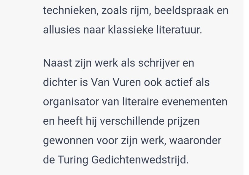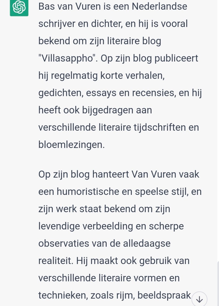 En van het een komt dan het ander. Er belanden via allerlei nieuwe kanalen mensen op dit blog die er normaliter niet komen en hopla, voor je het weet, is er iemand die me attendeerde op een Wikipediapagina over Bas van Vuren. Had ik helegaar geen weet van! Maar ook op die pagina staan helaas waar- en onwaarheden door elkaar heen. Mijn literaire blog heet natuurlijk helegaar geen “Villasappho” en ik heb vele prijzen gewonnen, maar nooit die van de Turing Gedichtenwedstrijd. Inmiddels (zondag 26 februari) is de hele pagina trouwens ineens niet meer op Wikipedia terug te vinden. Hoe dat ineens kan? Je kunt anoniem en online bezwaar aantekenen tegen Wikipedia pagina’s en dan wordt e.e.a. gecontroleerd en voor de zekerheid even offline gehaald. Uit welke hoek die bezwaarmakertjes vermoedelijk gekomen zijn laat zich raden. Maar voor mij is dat chatGPT dus AF: artificial fantasy.