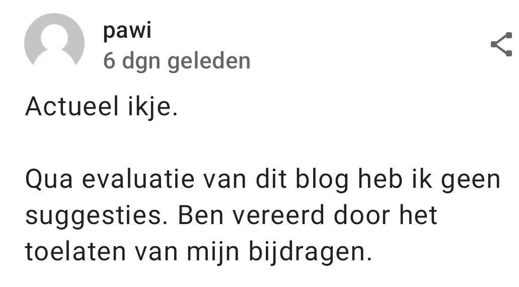 Wil jij trouwens net als Bertie, Suske en andere reageerders kans maken om in het volgende weekoverzicht voor te komen? Wil jij ook aardige vondsten debiteren naar aanleiding van ikjes? Wil je plezier hebben met lezers die voor je het weet goede kennissen van je kunnen worden? Misschien wil je een uitnodiging voor de jaarlijkse bijeenkomst van lezers van deze site? Of zeg je: doe mij dat maar allemaal?