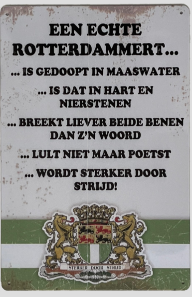 Je kunt over dat “Rotterdammert” zelfs een authentiek metalen wandbordje kopen, gesigneerd door Lee Towers, Davina Michelle en Ahmed Aboutaleb. Feyenoordsjaaltje niet inbegrepen. Ruikt een beetje naar Schmidt Zeevishandel.