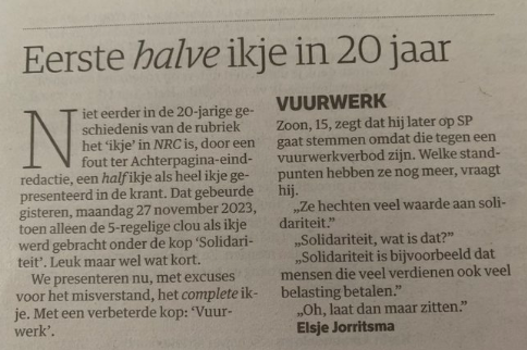 Een half ikje over solidariteit en vuurwerk. Chocoladeletters. Links en rechts. Met het hele gezin naar de rechter. LED-kaarsjes met uitblaasfunctie. En de zak van Sinterjetje. Daar ging het vorige week om in ikjesland. Het land dat bij elkaar geschreven wordt door lezers van de NRC.