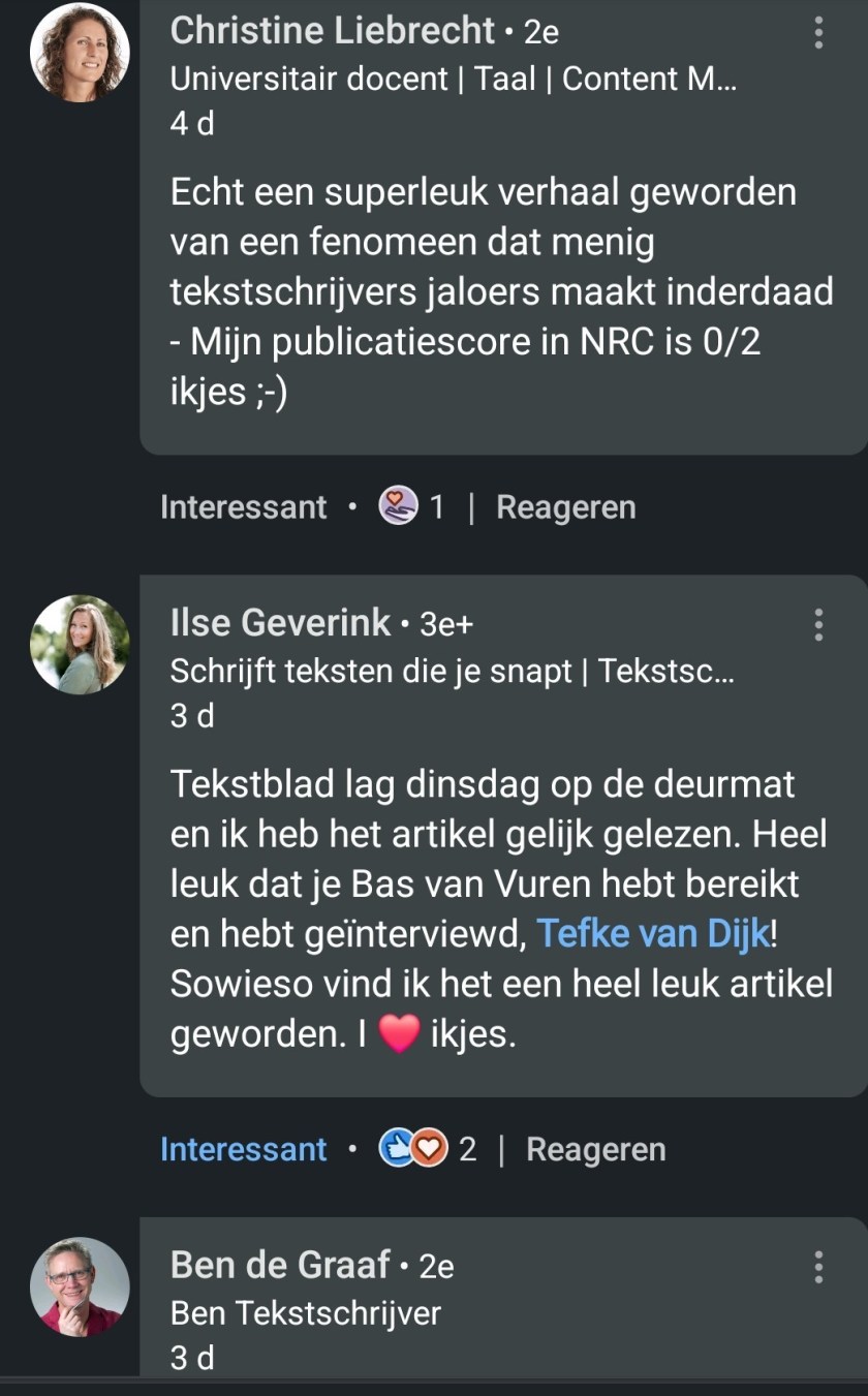 Intussen bleven de lezers van het Tekstblad toestromen. Massaal hebben ze de enige echte ikjesreviewsite nu toch echt gevonden. Hoezo dan? Dat komt door het recente nummer (1-2024) waarin Tefke van Dijk een boekje open doet over hoe je een geslaagd ikje schrijft. Ze heeft voor haar artikel de echte ikjescoryfeeen van Nederland geinterviewd. Keimooi allemaal en jawel, ik heb nog altijd niet de tijd gevonden om het nummer uitgebreid te recenseren in een apart blog. Komt nog. Geen haast bij. De vakbroeders en -zusters laten ook via Linkedin weten hoe blij ze met het artikel zijn. Dat Tefke erin is geslaagd om ene Bas van Vuren te bereiken en interviewen wordt ook erg gewaardeerd. Maar ja, zo moeilijk is dat toch niet? Contactformuliertje rechts bovenaan invullen en je krijgt nog dezelfde dag een antwoord.